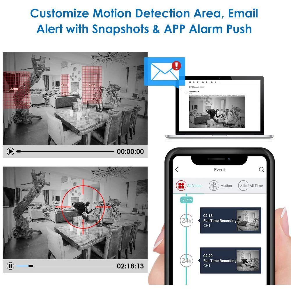 - Advanced Motion Detection & Instant alerts: You can customize a specific motion detection zone in each camera to minimize false alerts. Smart Instant notifications and email alerts will be pushed to your phone when the camera detects the motion.