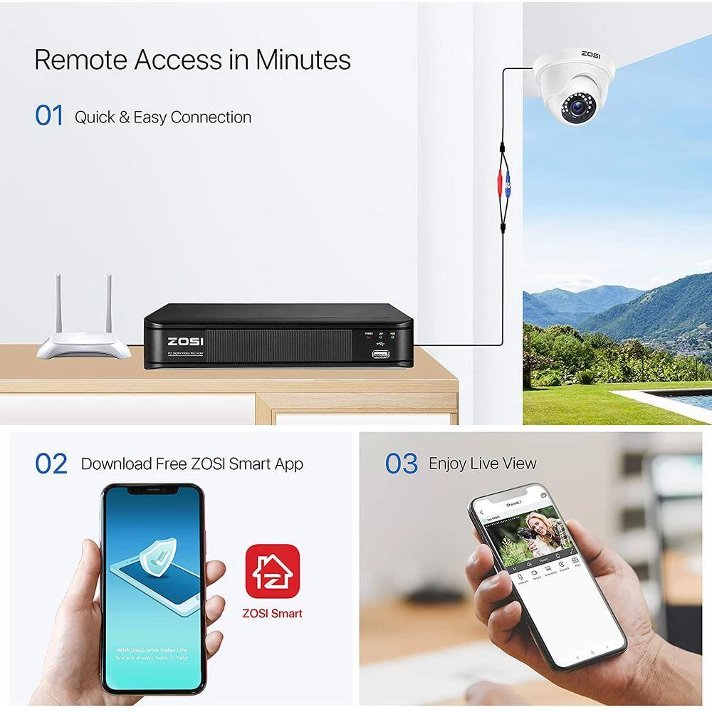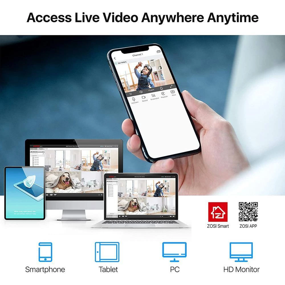 - Local view or remote view from multiple devices local viewing: no network needed while recording locally, remote viewing: download the ZOSI Smart app on your smartphone (iOS or Android) and enjoy up to 8 cameras simultaneous viewing on the app, you can also view the live view from computer