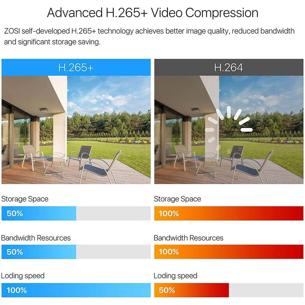 - Advanced H.265 plus high efficiency video compression: ZOSI self-developed H.265 plus video coding technology extract features that focus on characteristics of the surveillance scenes for larger storage space and better image quality, H.265 plus can further improve compression ratio on the basis of H.265 standard and save about 80% storage compared with H.264, and thus effectively saving storage resources and provides an excellent and smooth viewing experience