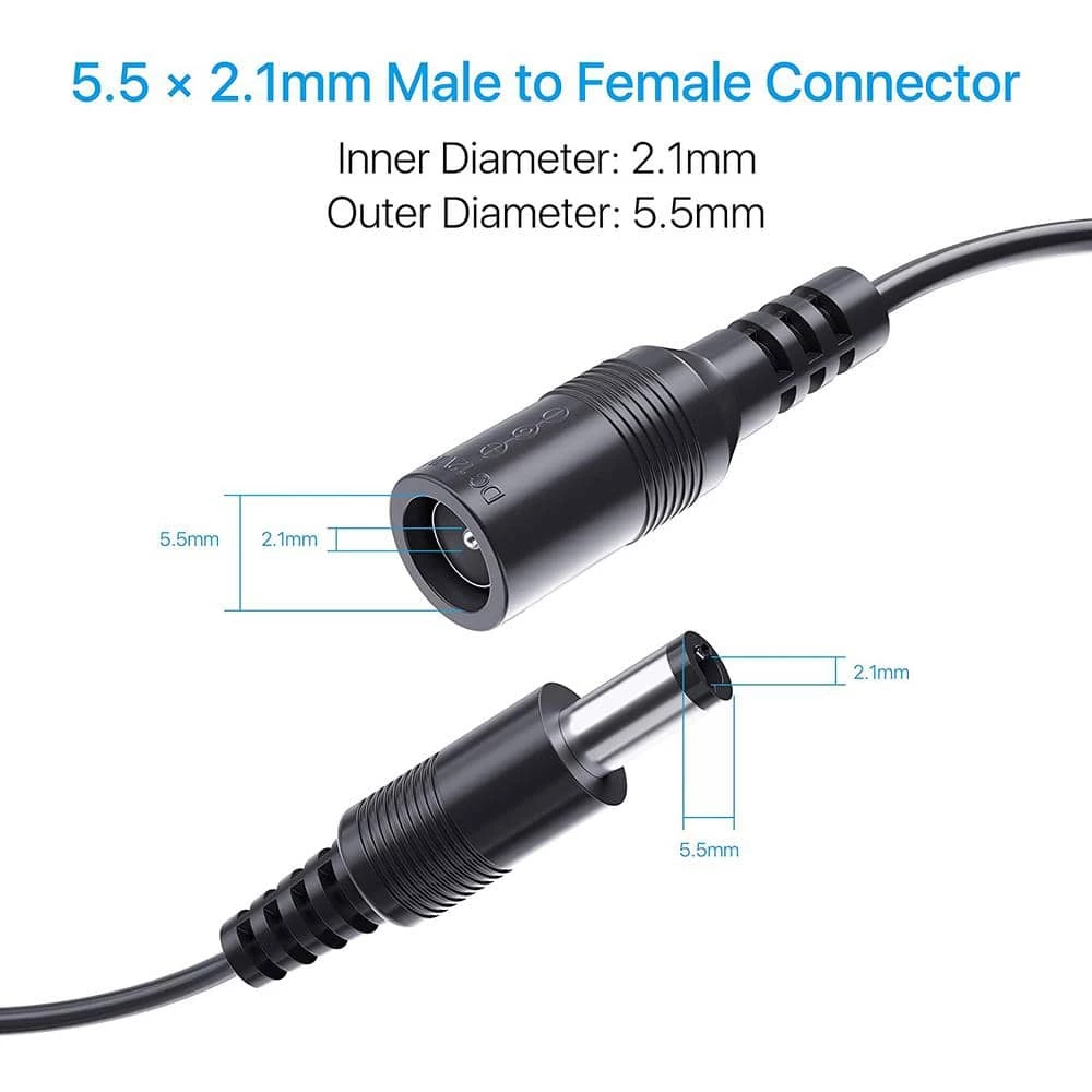 - Compatible with 12-Volt 2.1 mm x 5.5 mm power adapter: to extend the adapter cable for any brand IP security camera and CCTV security camera, standalone DVR, LED light strip and others that requires DC input and accept 12-Volt 2.1 mm x 5.5 mm plug