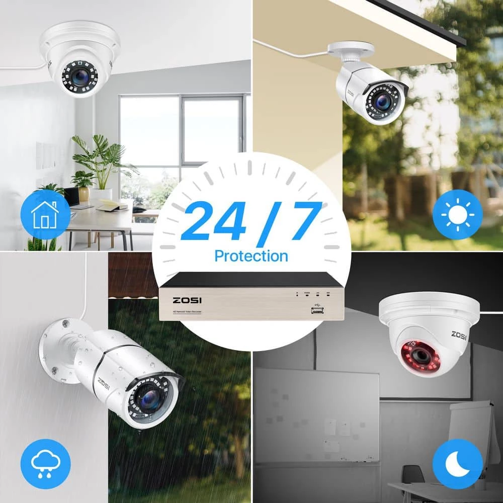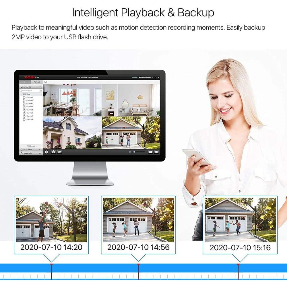 ZOSI surveillance systems are designed for your home and business with easy installation and operation.The advanced H.265+ video compression technology provide you more faster loading speed, 50% less storage space and lower resource/data consumption. The system features Full HD day&night, human detection, Instant email/APP alerts, customize each camera with 4 different recording modes, smart playback&searching, etc. With free ZOSI Smart App, you can keep tabs on what’s happening at your home or business and watch the high-quality video on your Smartphone/Tablet/PC.