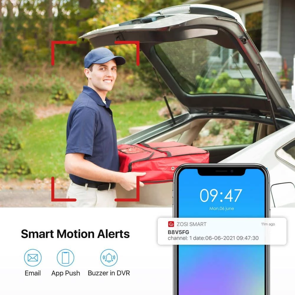 - Customizable motion detection zone and alerts – be notified when there are unexpected movements, smart notifications with image will be pushed to your smartphone via iPhone/Android app, you also can setup the detection zone from your DVR to minimize false alarms