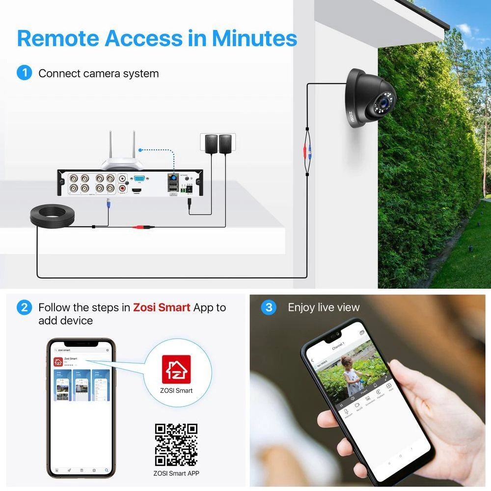 ZOSI surveillance systems are designed to meet your home and business needs with easy installation and operation. The advanced H.265 plus video Compression technology provide you more faster loading speed, 50% less storage space and lower resource/data consumption. The system features Full HD night vision, human detection, Instant email/APP alerts, customize each camera with 4 different recording modes, smart playback, etc. with this HD security system, you can keep tabs on what’s happening at your home or business and watch the high-quality video on your Smartphone/Tablet/PC.