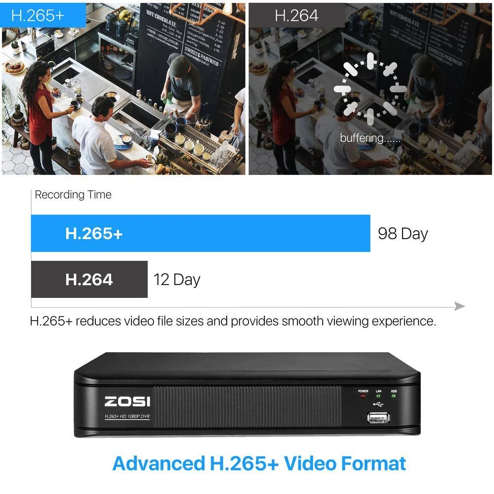 - ZOSI self-developed H265+ video coding technology focus on a larger storage space and better image quality, the technology improve compression ratio on the basis of H265 standard, save about 80% storage compared with H264, which can effectively store resources and provides excellent smooth viewing experience
