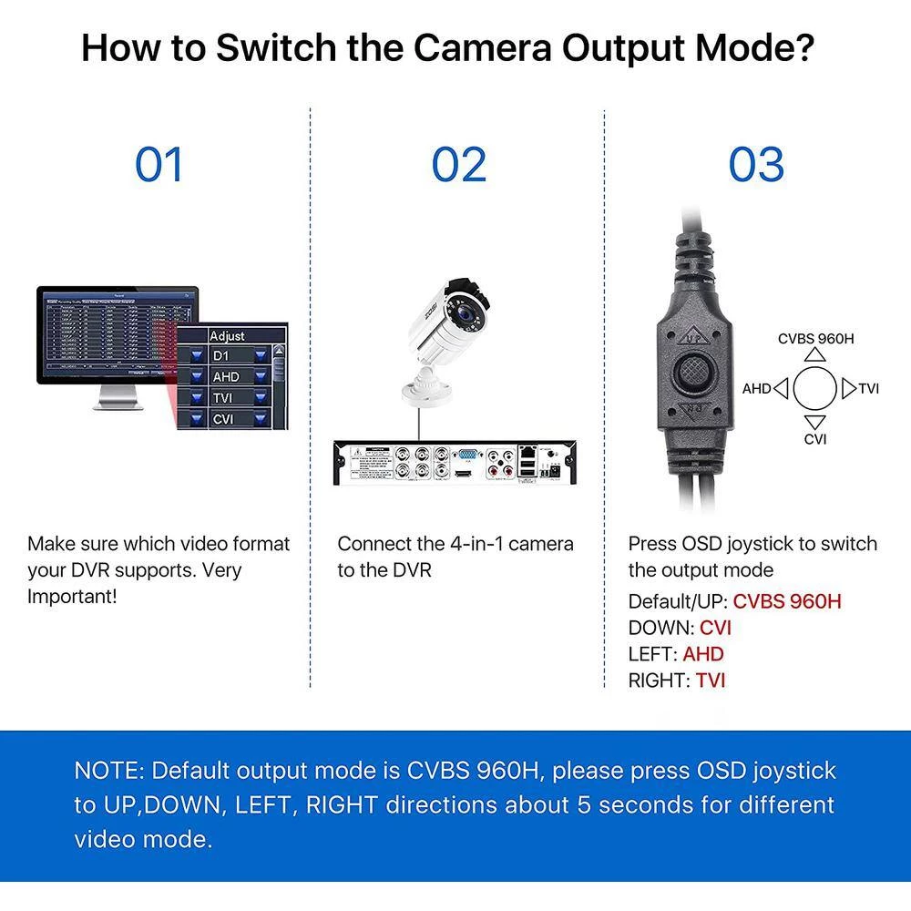 - 1080P hybrid 4-in-1 HD-CVI/TVI/AHD/analog: it comes with OSD menu which can change 4 different video output TVI/AHD/HD-CVI/CVBS and adjust the video settings the default mode is 960H you can change the OSD menu by holding the button for about 5-seconds