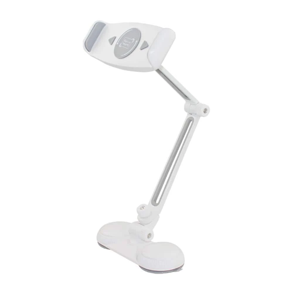 The 7-12 in. Tablet Holder by proHT. Highly portable and lightweight with midget size design echoes with your sleek tech gadgets and very easy to travel with and even featuring special cutouts on the holder for housing the power cord a true tablet computer stand with rubber padding for protection. For use as iPad mini holder mount for bed and mobile display.