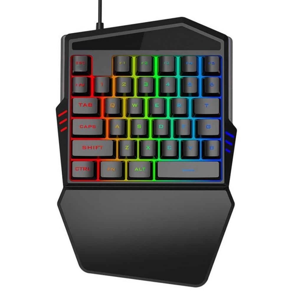 SANOXYOne-Hand Keyboard With Backlight 35 Keys Gaming Mechanical Keyboard For Pc Computer Android Windows. “Light effect mode:1.Luminous characteristics: LED color backlight, more cool at night. 2. The keyboard backlight function is controlled as follows:FN+ESC button for light switching off function. 3. Can be configured into different kinds of language versions,according to customer needs.4. The keyboard supports running on Win 2000, Win XP, Win ME, Vista, Win7, Win8, Androed, Linux, Apple and other operating systems.FN combination function:Support multimedia function keys, the operation is as follows:(1).FN+F1 button: music player(2).FN+F2 key: volume decrement(3).FN+F3 button: increased decrement.(4).FN+F4 button: mute (5).FN+F5 key: pause.