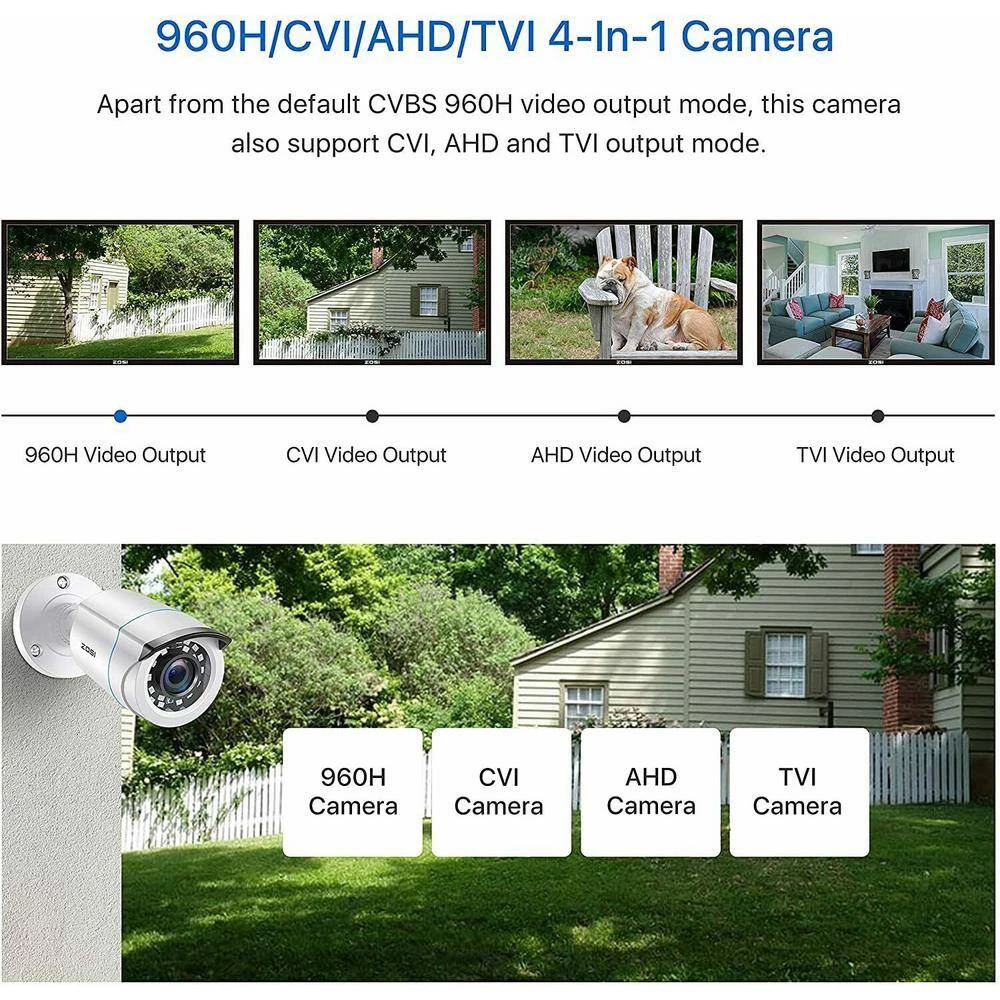 - 1080P hybrid 4-in-1 HD-CVI/TVI/AHD/analog: this is 4-in-1 TVI/CVI/AHD/CVBS bullet camera compatible with 960H,720P,1080P,3MP,5MP,8MP,4K HD-TVI, AHD, CVI and CVBS/960H analog DVRs