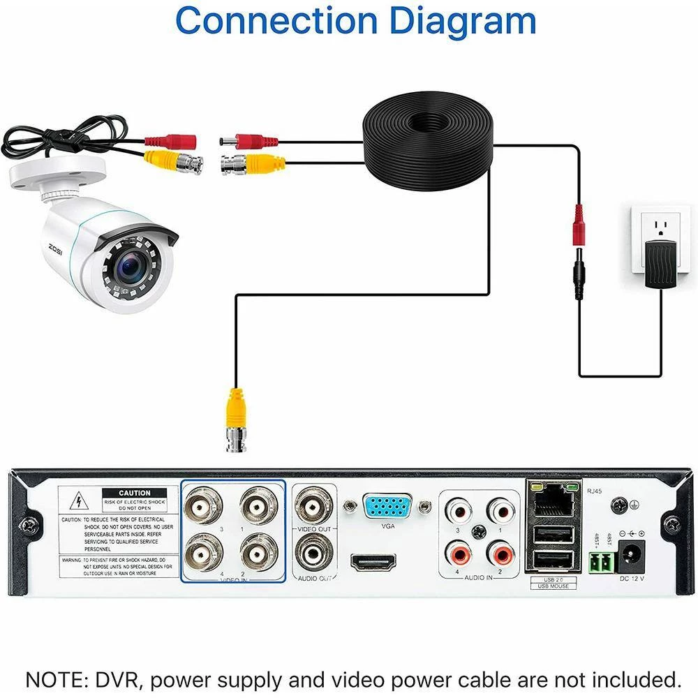 - Note: no CCTV cable and power supply, this is a hard-wired camera, it need to connect the cctv cable and power supply (not included), this camera could not work separately, it need to connect to the DVR to work
