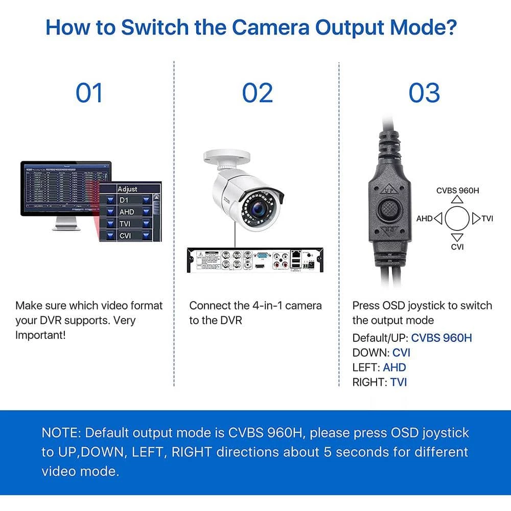 - Default Video Mode is Analog 960H Mode: Compatible with HD-CVI/TVI/AHD/Analog DVRs. However, if you want to switch to 1080p video mode, please make sure your DVR support 1080p resolution , or it won’t show 1080p images.